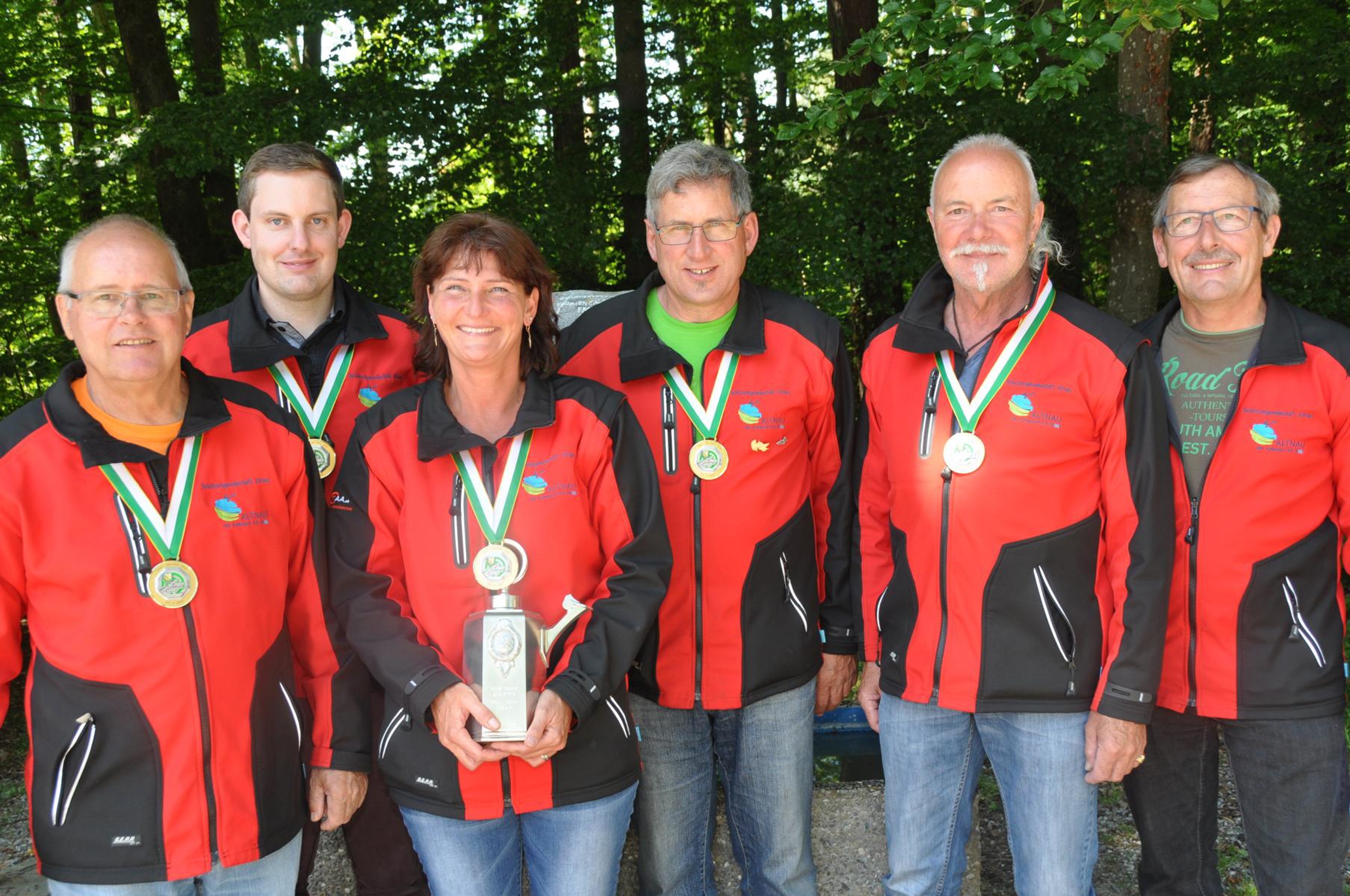 Kantonalmeister Feld A: SG Altnau (v.l.): Josef Stachel, Christian Marolf, Sandra Marolf, Ruedi Indergand, Werner Nieder-häuser mit Coach Werner Marolf