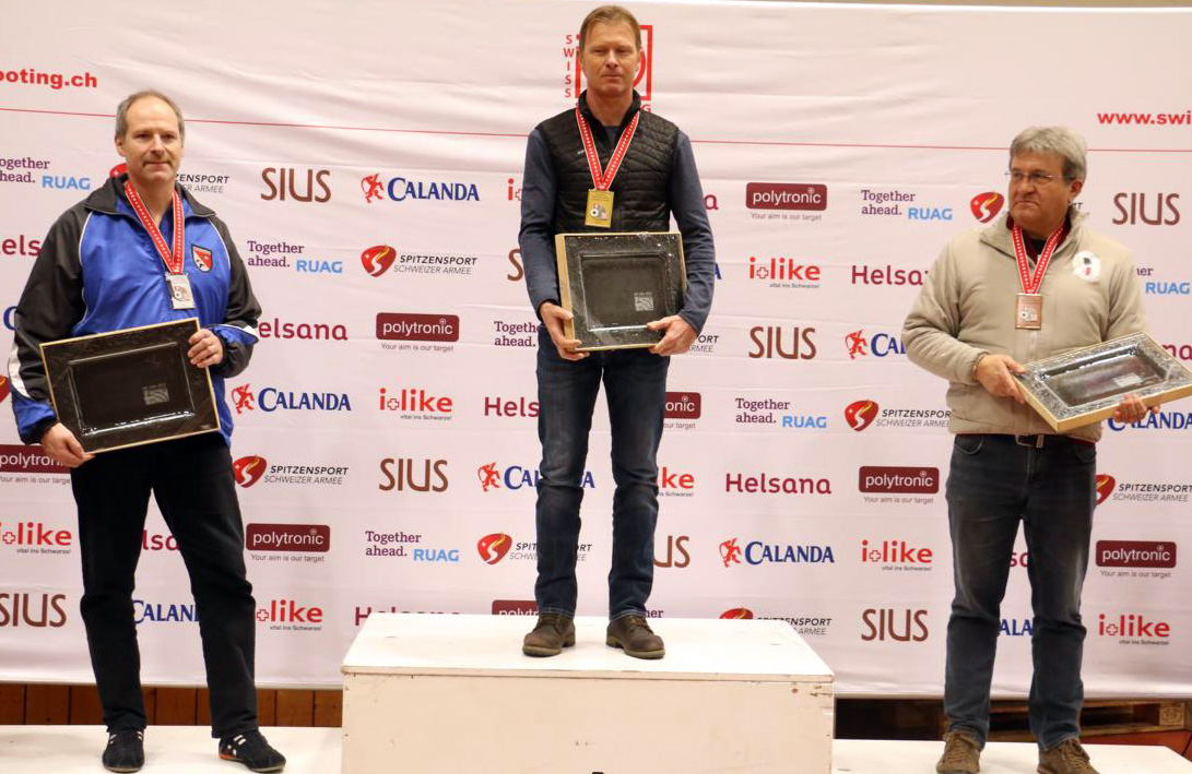 Bei den Seniorenveteranen heisst der Pistolensieger Enzo Jurietti und kommt aus Airolo (TI). Er erhielt die Goldmedaille überreicht von seinem Tessiner Landsmann, SSV-Präsident Luca Filippini, der auch dem zweitplatzierten Rolf Saurer aus Pfäffikon (ZH) und dem Dritten Ruedi Habegger aus Schlatt (TG) die Medaillen umhängte. Bei den Senioren P10m traten nur 17 Personen zum Wettkampf an. Der Sieg ging da ins Wallis an Andreas Truffer aus Lalden mit 288 Punkten und 11 Innenzehner. Aufs gleiche Total kam Stephan Lehmann aus Obergösgen (SO), erzielte aber mit 96 Zählern die schlechtere Schlusspasse. Dritter mit 287 Punkten wurde Philippe Antonioli, der aus Bramois im französischsprachigen Teil des Wallis kommt.