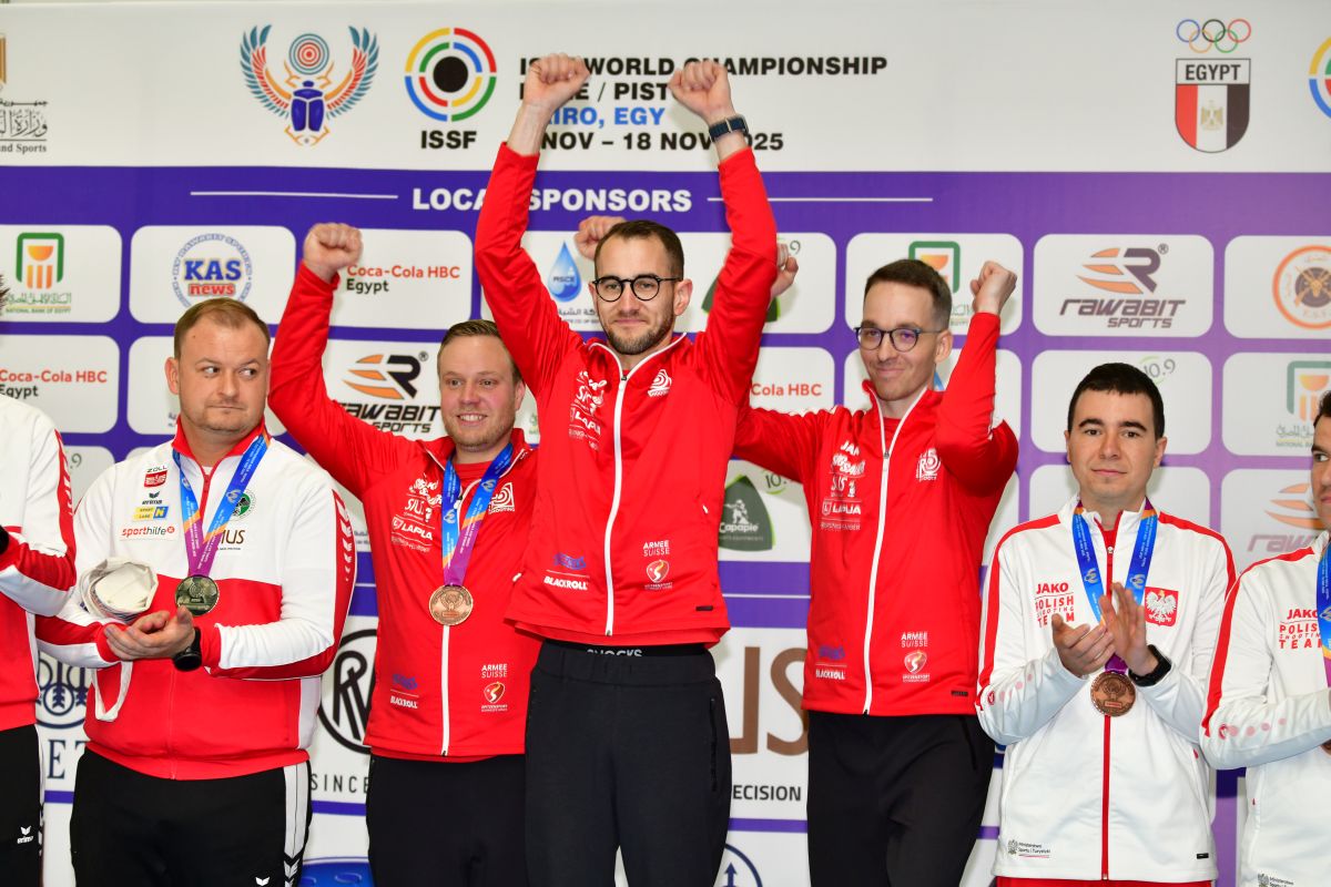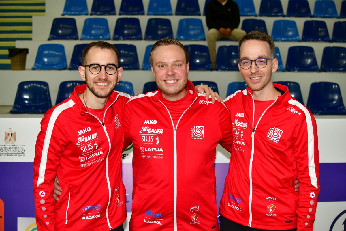 Auch die 300m-Gewehrschützen lassen heute die Korken knallen. Im Dreistellungwettkampf siegten Gilles Dufaux, Sandro Greuter und Pascal Bachmann im Team und konnten damit ihren Titel von 2023 in Baku (AZE) nicht nur verteidigen; sie übertrafen ihr damaliges Resultat um rund 12 Punkte!