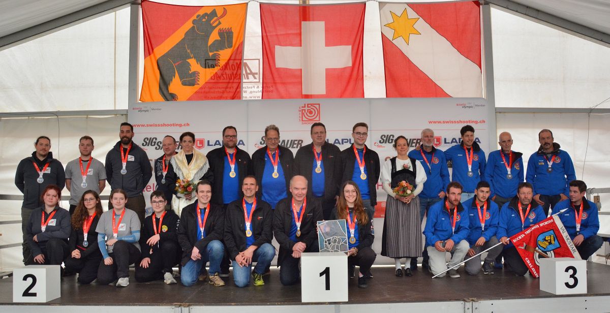 Podest NLA Sport (v.l.): 2. Aarau Schützengesellschaft; 1. Thun Stadtschützen; 3. Oberwinterthur Standschützen, mit den Ehrendamen Iris Bhend-Wenger und Stefanie Koller-Ritz.