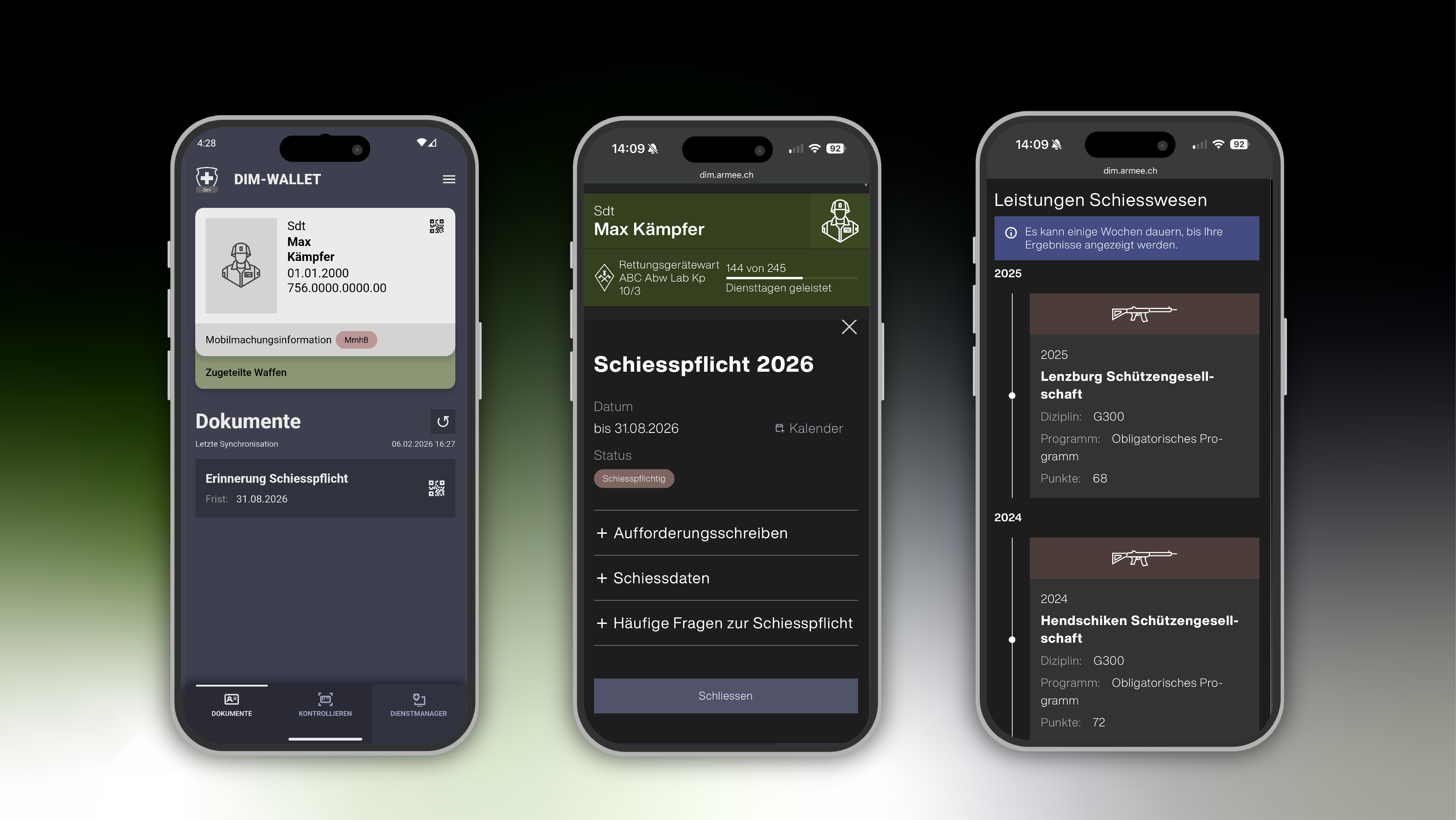 Die Aufforderung zum obligatorischen Programm wird neu im Dienstmanager, der digitalen Plattform zur Verwaltung des Militärdienstes, bereitgestellt. Schiesspflichtige können sich damit am Schiessstand digital über die DIM-Wallet App ausweisen und ihre Resultate online einsehen, sobald diese vom Schiessverein entsprechend registriert wurden.