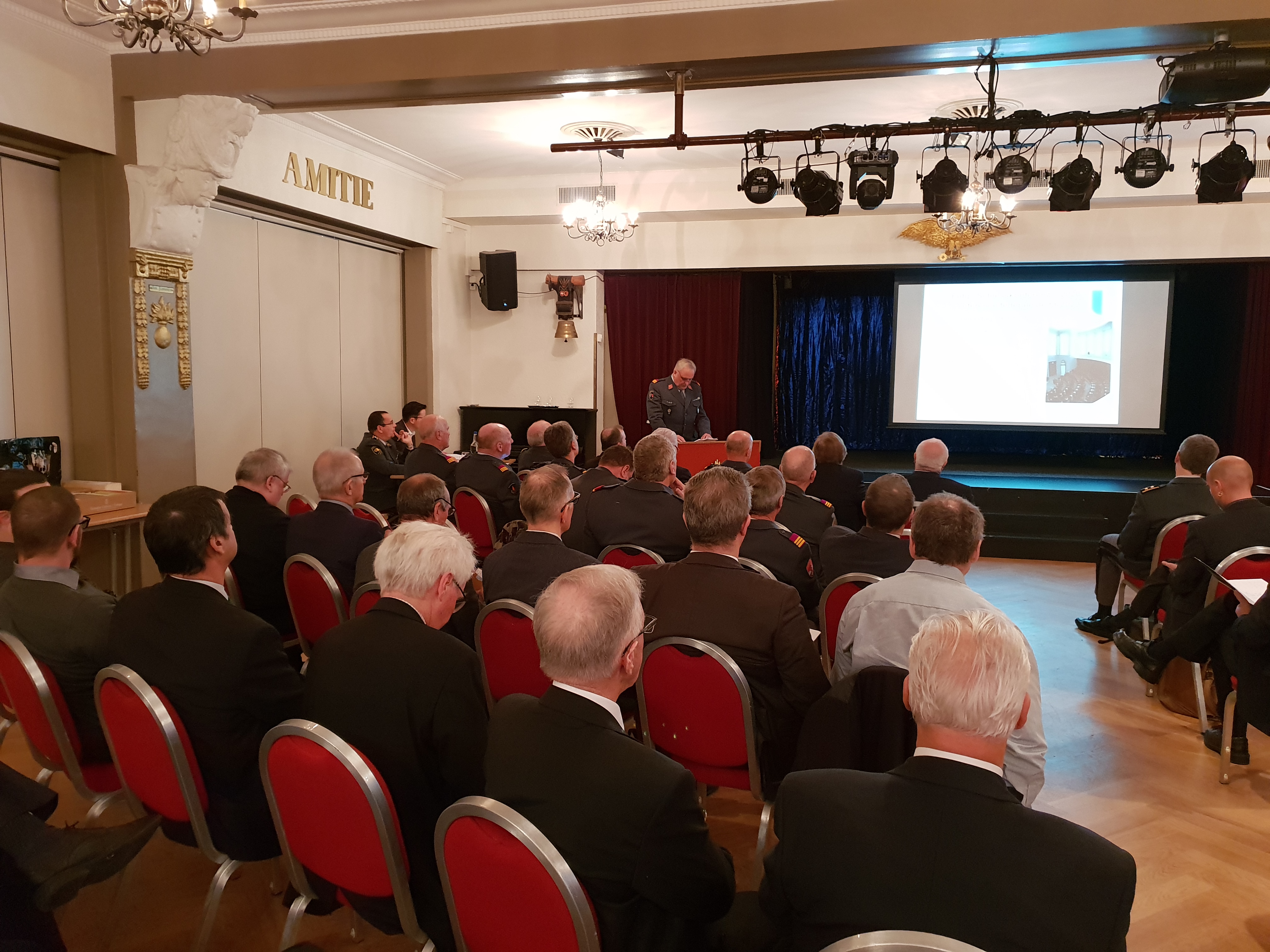Im militärisch angehauchten Restaurant "le VG" inmitten der Stadt Genf tagten heute ranghohe Armeerepräsentantinnen und Repräsentanten, samt eidgenössischen Schiessoffizieren, zur Eidgenössischen Schiesskonferenz 2019 unter der Leitung von Brigadier Jacques Rüdin. Auch wenn der Raum mit Flaggen in Rottönen ausgeschmückt ist, bleibt die prädominante Farbe das Grün des Tenue A. Nur wenige sind in Zivil gekleidet.